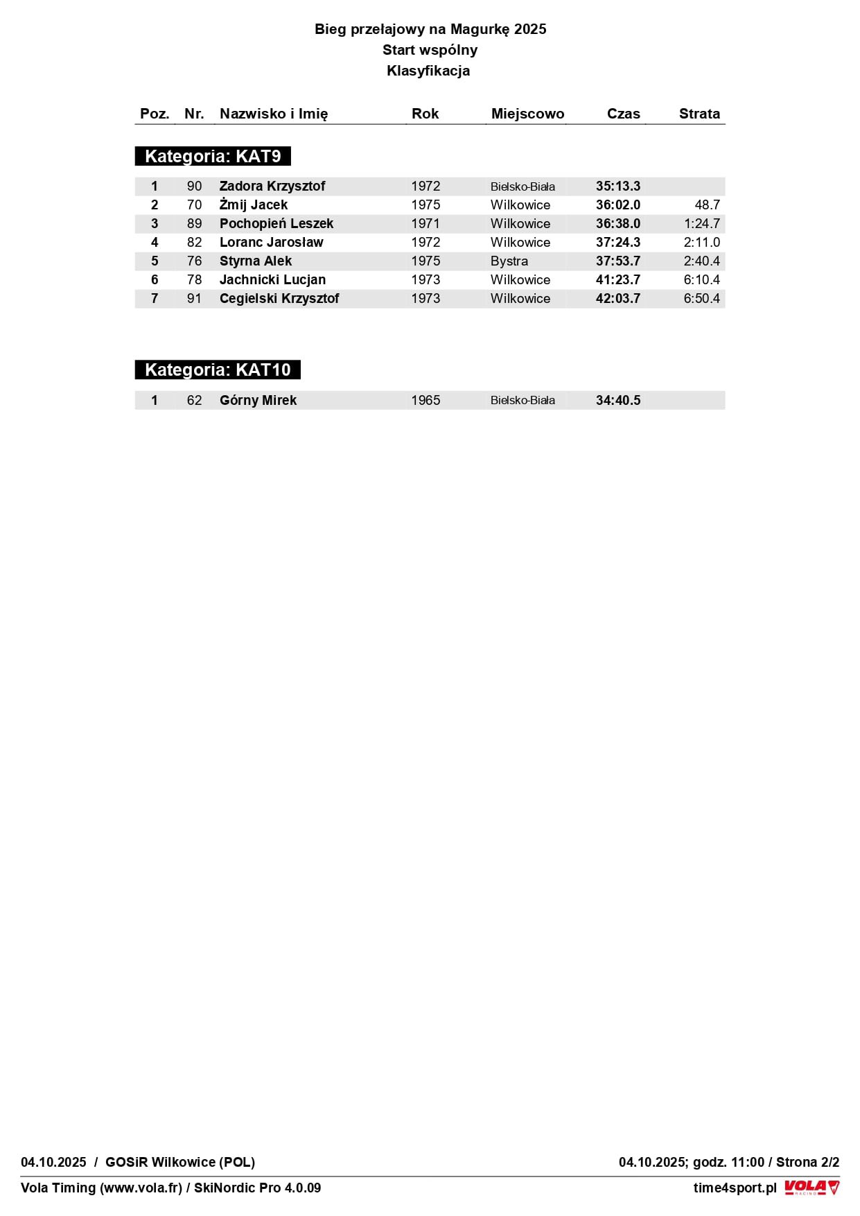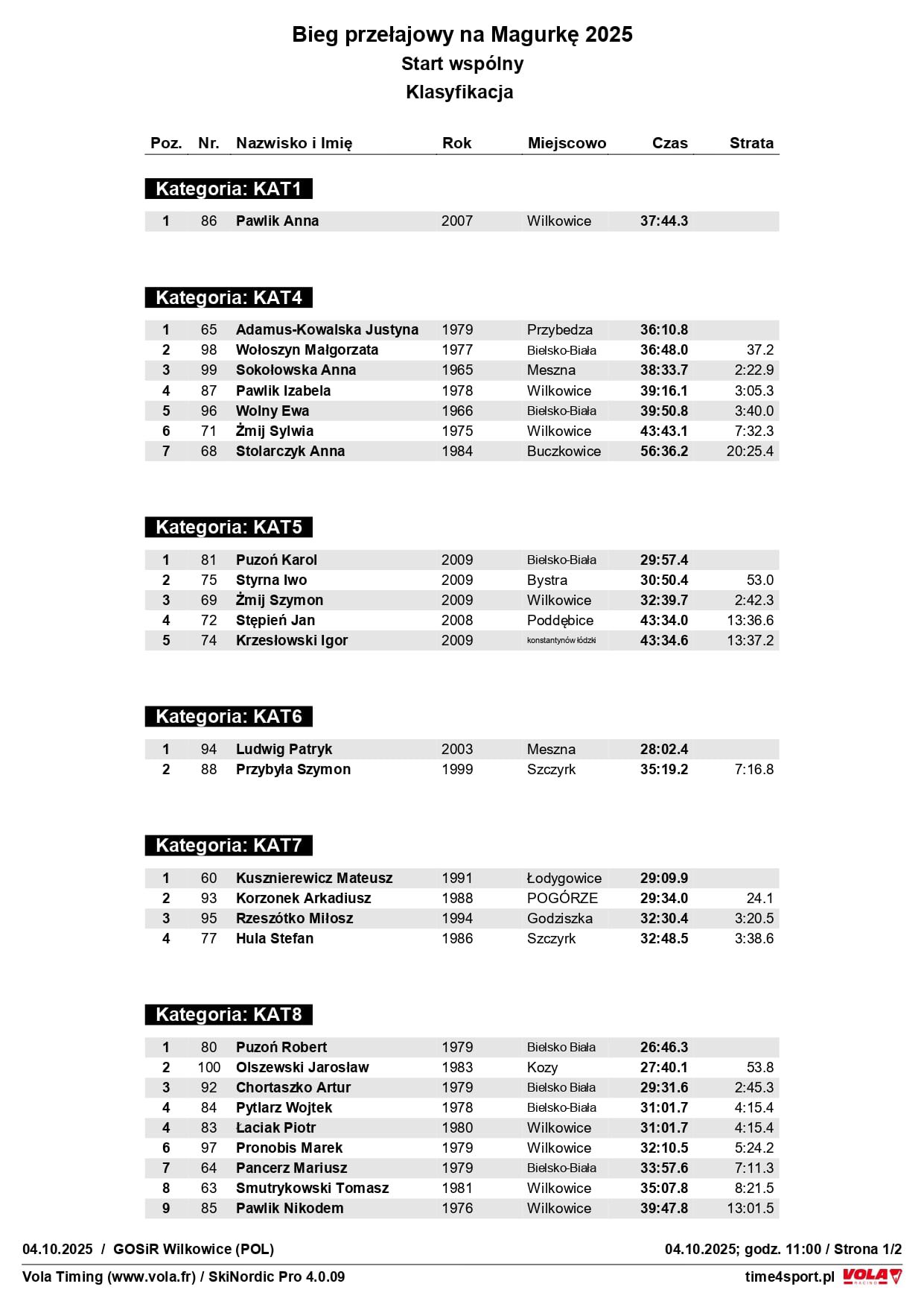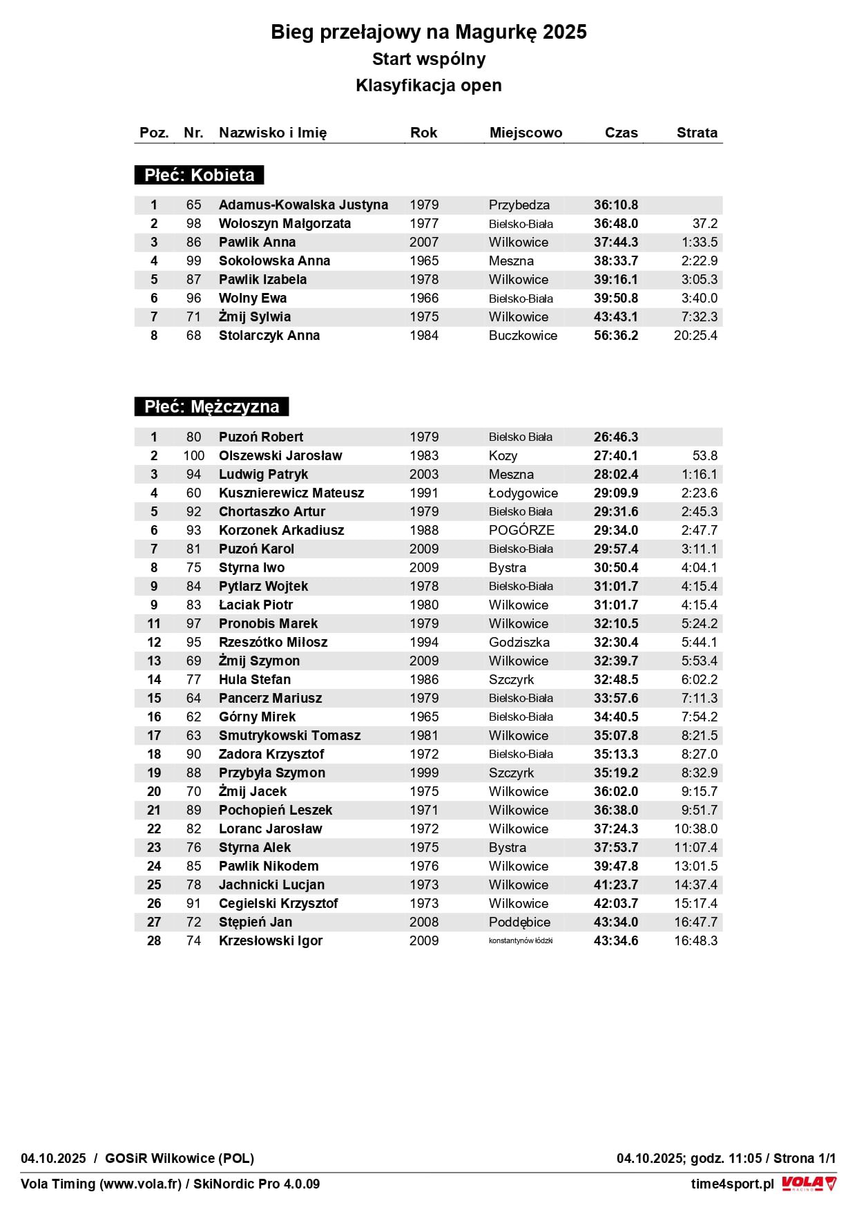 Metę na Magurce Wilkowickiej najszybciej osiągnął Robert Puzoń z Bielska-Białej z czasem 26:46,3 sek., wyprzedzając Jarosława Olszewskiego z Kóz (strata 53,8 sek.) oraz Patryka Ludwiga z Mesznej (strata 1:16,1 sek.). Wśród kobiet zwyciężyła Justyna Adamus-Kowalska z Przybędzy z czasem 36:10,8 sek., przed Małgorzatą Wołoszyn z Bielska-Białej (strata 37,2 sek.) oraz Anną Pawlik z Wilkowic (strata 1:33,5 sek.). Wyłoniono ponadto triumfatorów w poszczególnych kategoriach wiekowych kobiet i mężczyzn. SZCZEGÓŁOWE WYNIKI W PLIKACH DO POBRANIA.